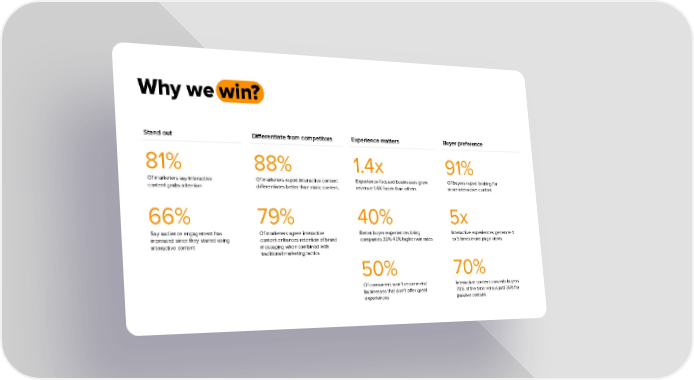 Why we win? Stand out 81% Of marketers say interactive content grabs attention 66% Say audience engagement has increased since they started using interactive content Differentiate from competitors 88% Of marketers report interactive content differentiates better than static content. 79% Of marketers agree interactive content enhances retention of brand messaging when combined with traditional marketing tactics Experience matters 1.4x Experience-focused businesses grew revenue 1.4X faster than others 40% Better buyer experiences bring companies 20%-40% higher win rates Buyer preference 91% Of buyers report looking for more interactive content 5x Interactive experiences generate 4 to 5 times more page views 50% Of consumers won’t recommend businesses that don’t offer great experiences 70% Interactive content converts buyers 70% of the time versus just 36% for passive content