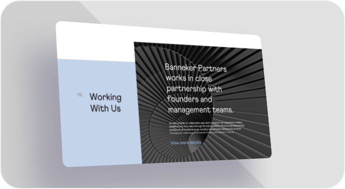 Banneker Partners works in close partnership with founders and management teams. We take a hands -on collaborative approach to support our companies in building sustained long -term value through the implementation of proven operational best practices in all functional areas, including sales, product management, product development, marketing, professional services, and customer success. Working With Us 02 View more details